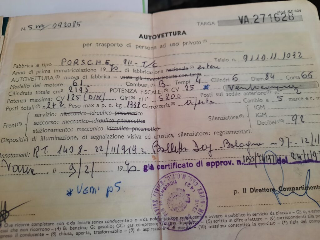Storia e Documentazione Questa 911T è un’auto di grande interesse storico, come confermato dal suo libretto di circolazione a pagine dell’epoca. Immatricolata per la prima volta in Italia nel 1970, conserva la sua targa originale della provincia di Varese, un dettaglio fondamentale per i collezionisti più esigenti che cercano l’autenticità.