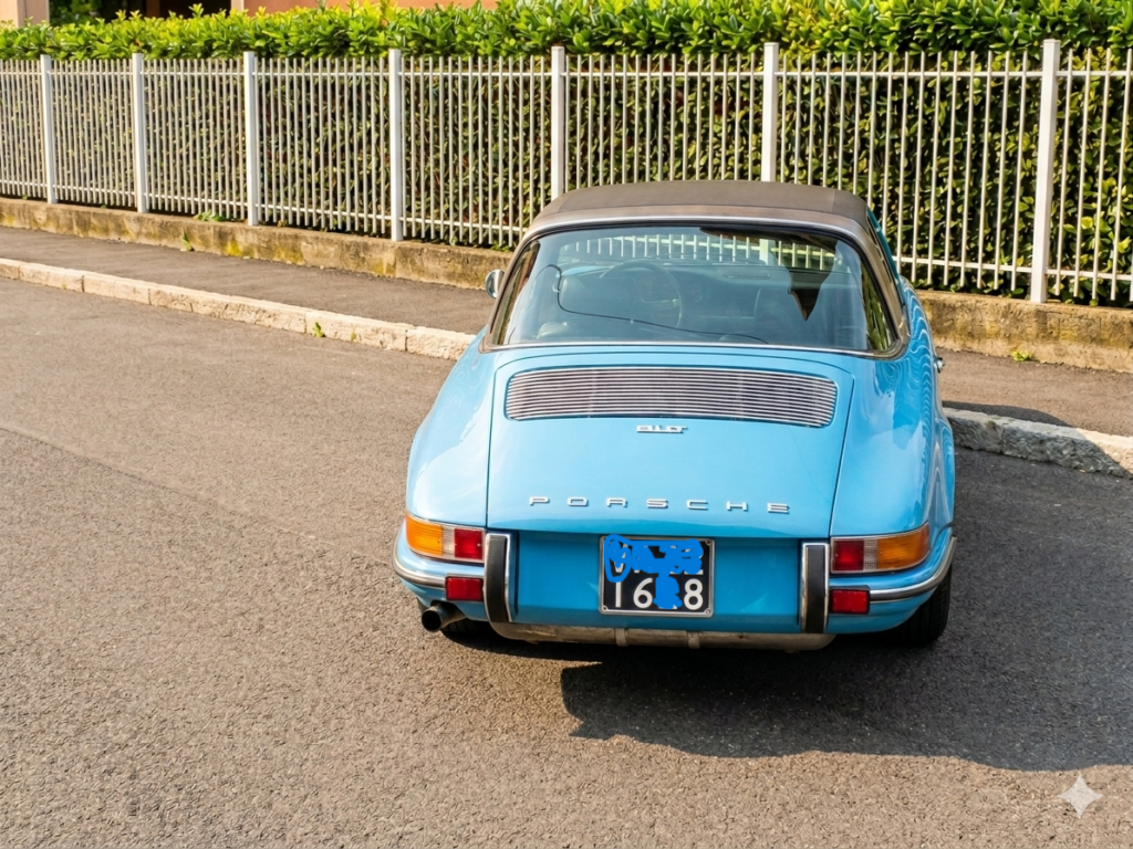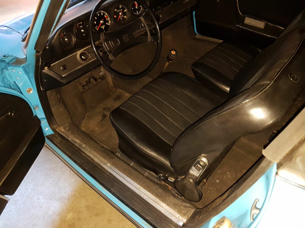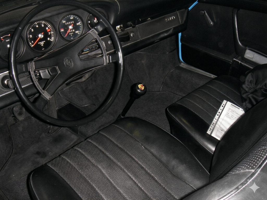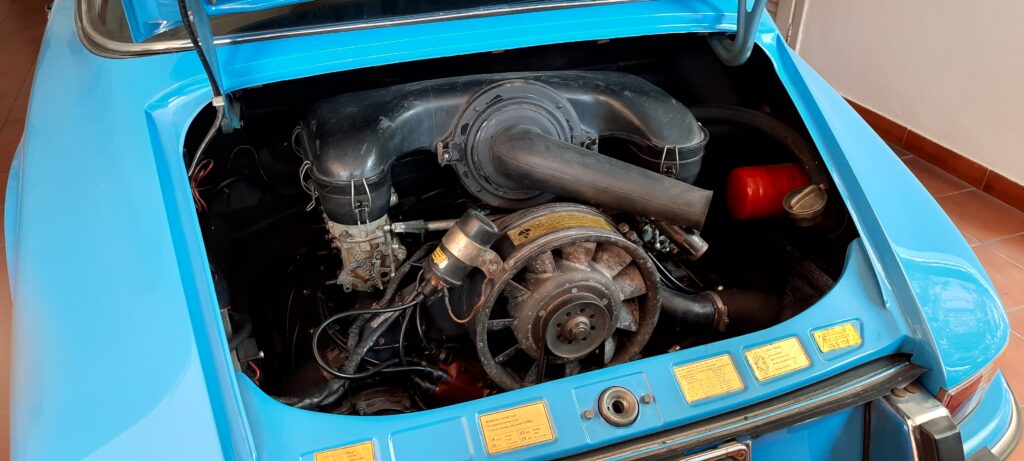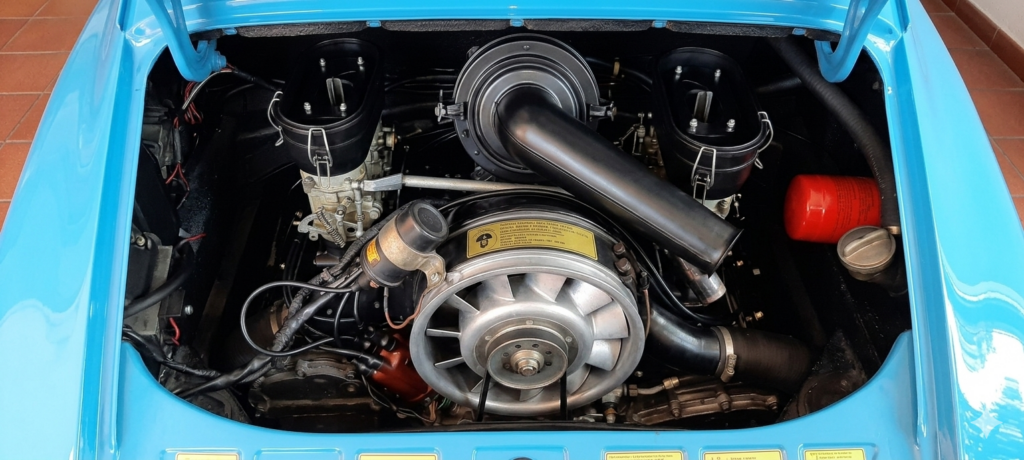 Estetica e Carrozzeria La carrozzeria si presenta in condizioni splendide, con una verniciatura brillante nella sua tonalità azzurra tipica degli anni ’70. Il roll-bar Targa è correttamente rifinito in acciaio satinato e il tetto rimovibile è in ottimo stato di conservazione. Completano il look gli iconici cerchi Fuchs, corretti per il modello e privi di graffi evidenti.