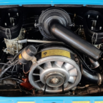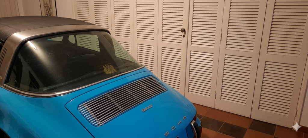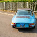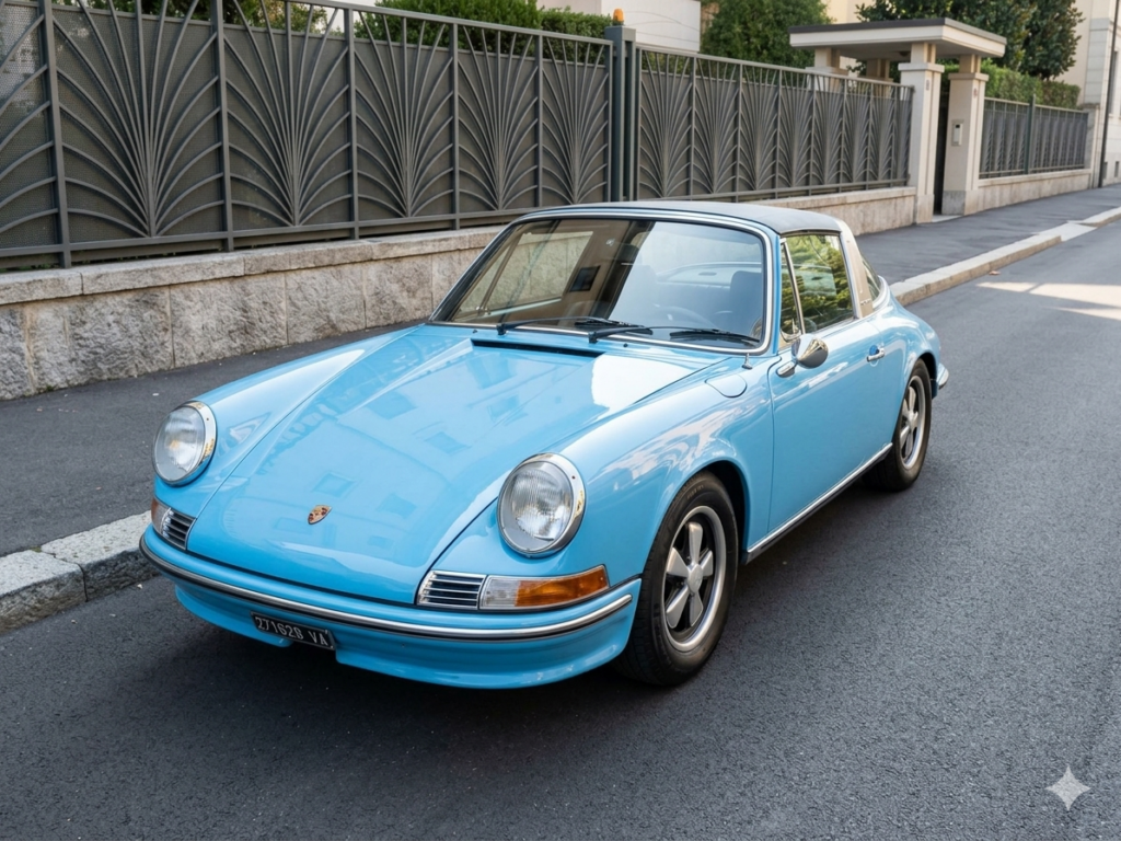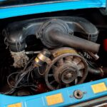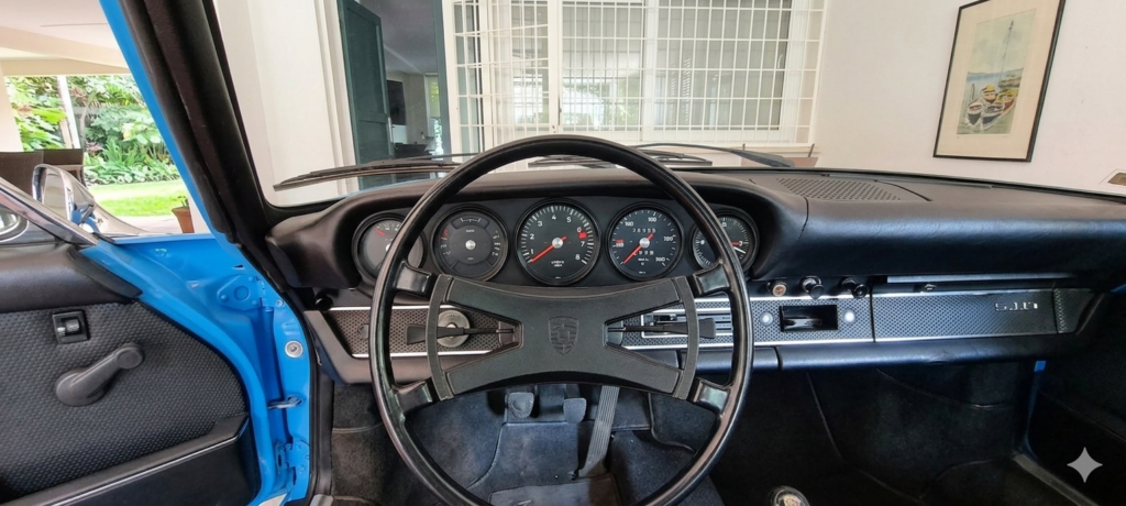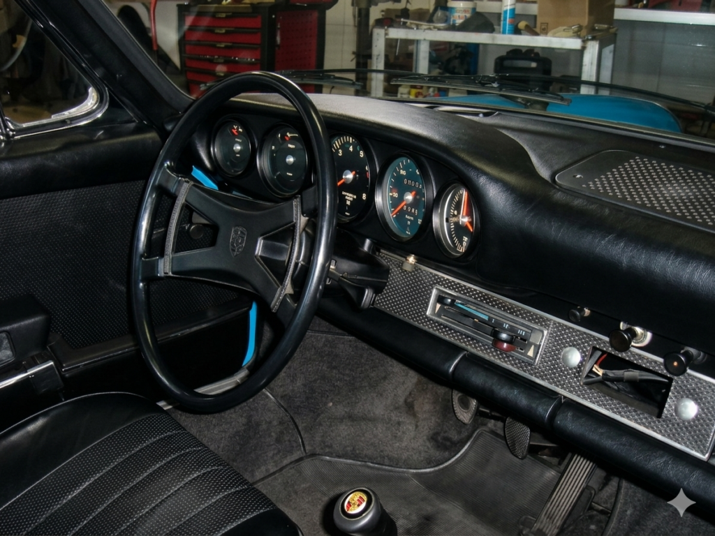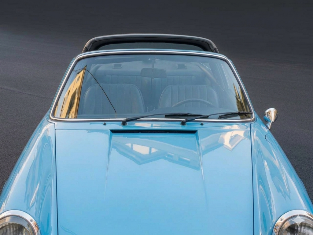 Estetica e Carrozzeria La carrozzeria si presenta in condizioni splendide, con una verniciatura brillante nella sua tonalità azzurra tipica degli anni ’70. Il roll-bar Targa è correttamente rifinito in acciaio satinato e il tetto rimovibile è in ottimo stato di conservazione. Completano il look gli iconici cerchi Fuchs, corretti per il modello e privi di graffi evidenti.