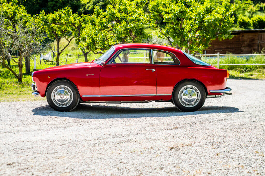 Uno degli esemplari costruiti nel primo anno di nascita della Sprint, prodotta alla fine del 1955 e venduta a Firenze il 12 Gennaio 1956, nel colore rosso Alfa con interni in panno chiari a contrasto con la finta pelle rossa.