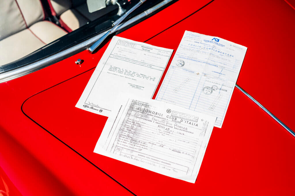 Car eligible for 1000 Miglia, complete with chronological extract “Estratto cronologico”, ASI, FIVA, RIAR approval and Alfa Romeo certificate. Visible by appointment in Cesena.