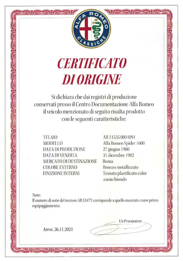 Questa vettura possiede certificato di originalità Alfa Garage, il primo marchio per l’assistenza e manutenzione della tua Alfa Romeo d’epoca.