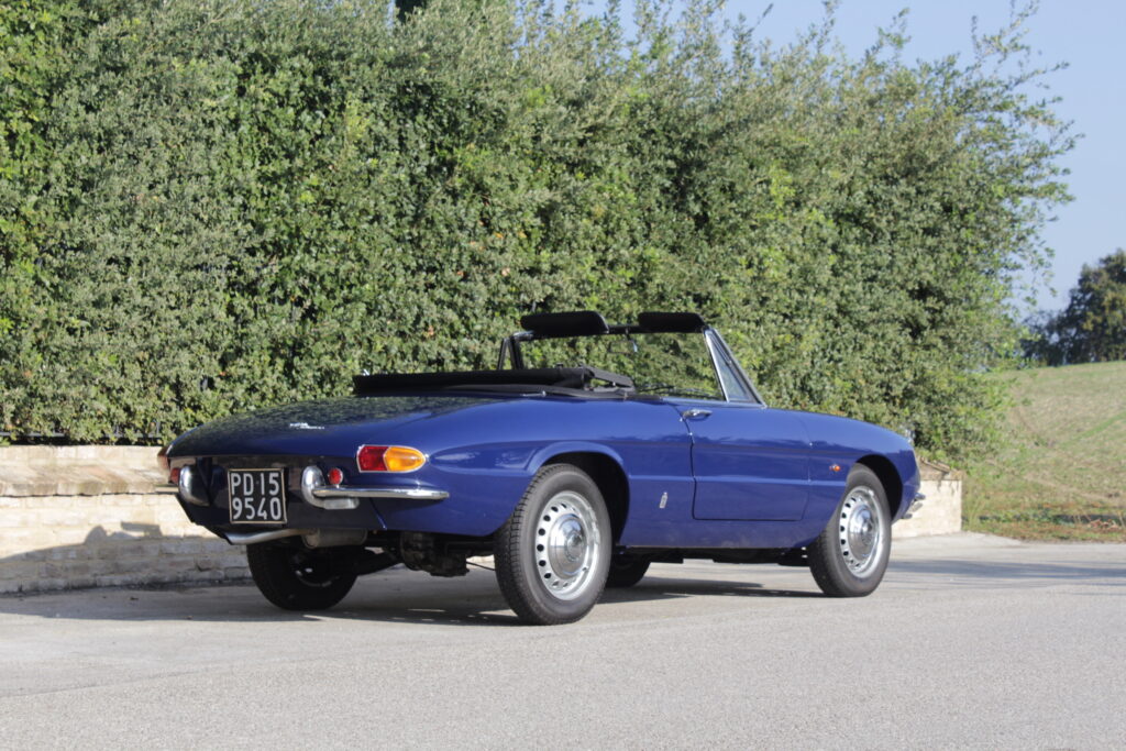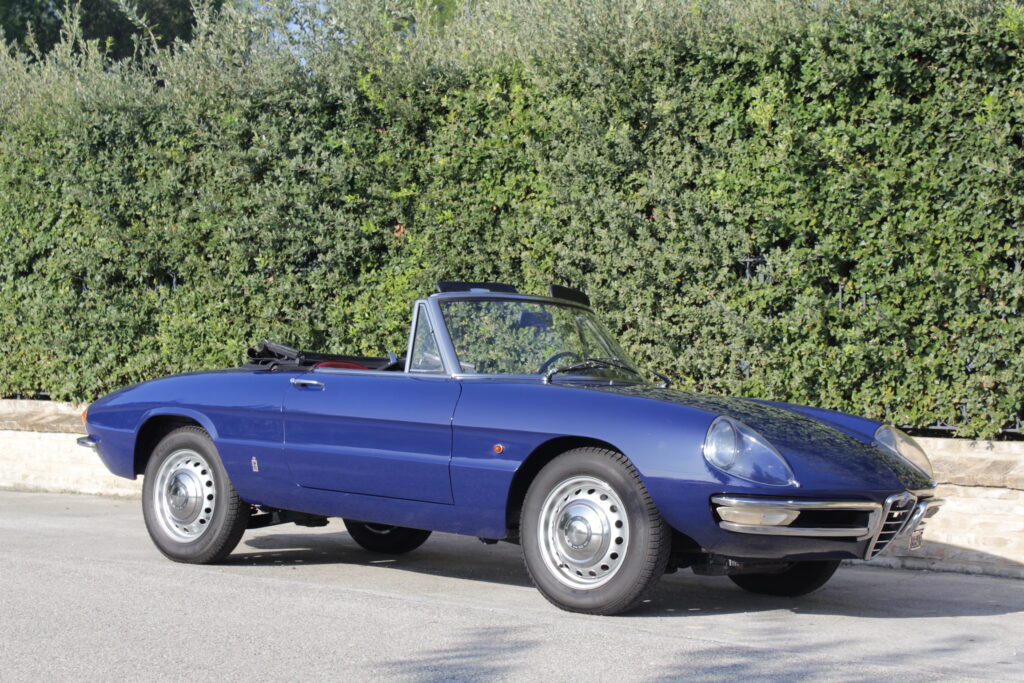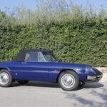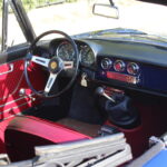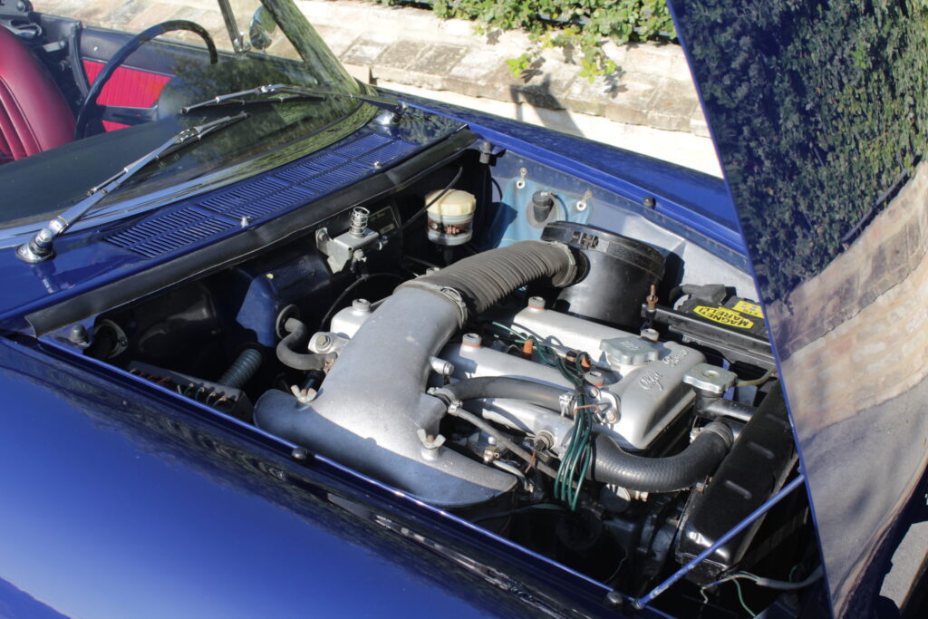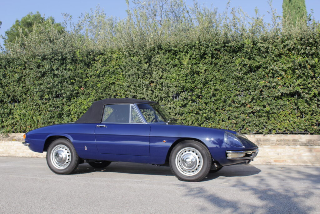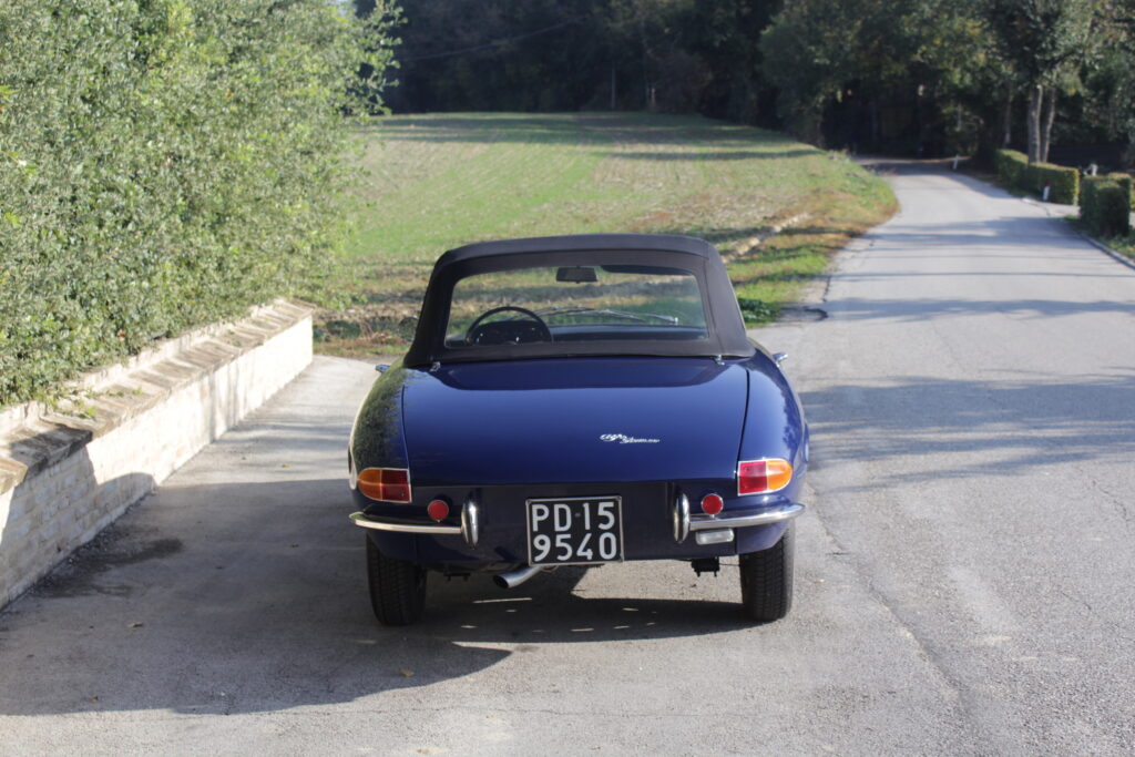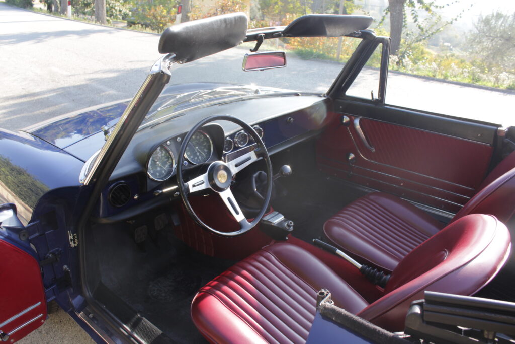 Questo esemplare blu medio con interni rossi viene immatricolato ad Aprile 1966 e appartiene al primo lotto di 200 esemplari privi di servofreno e impianto frenante Dunlop con freccia laterale dietro il passaruota.