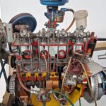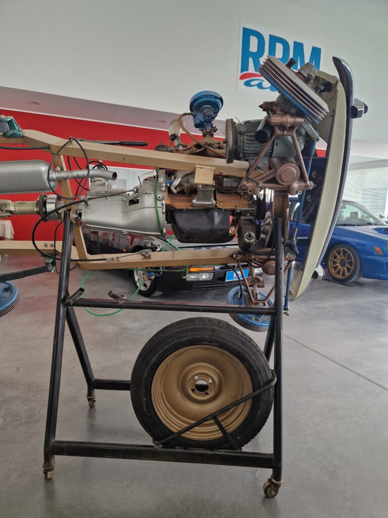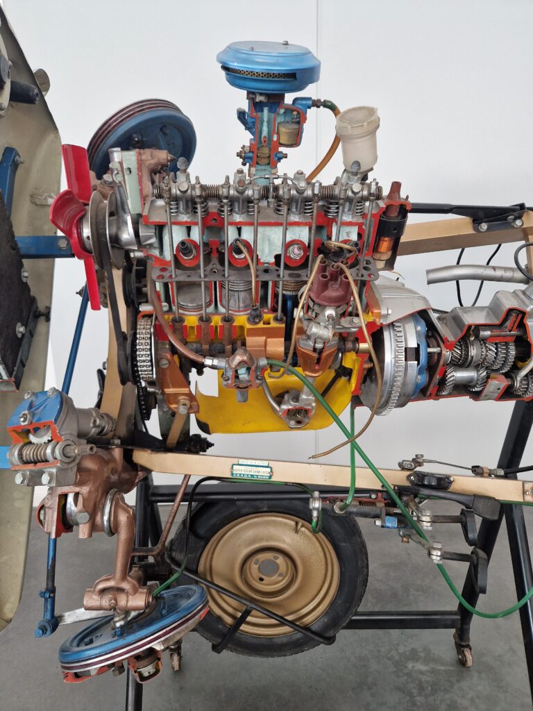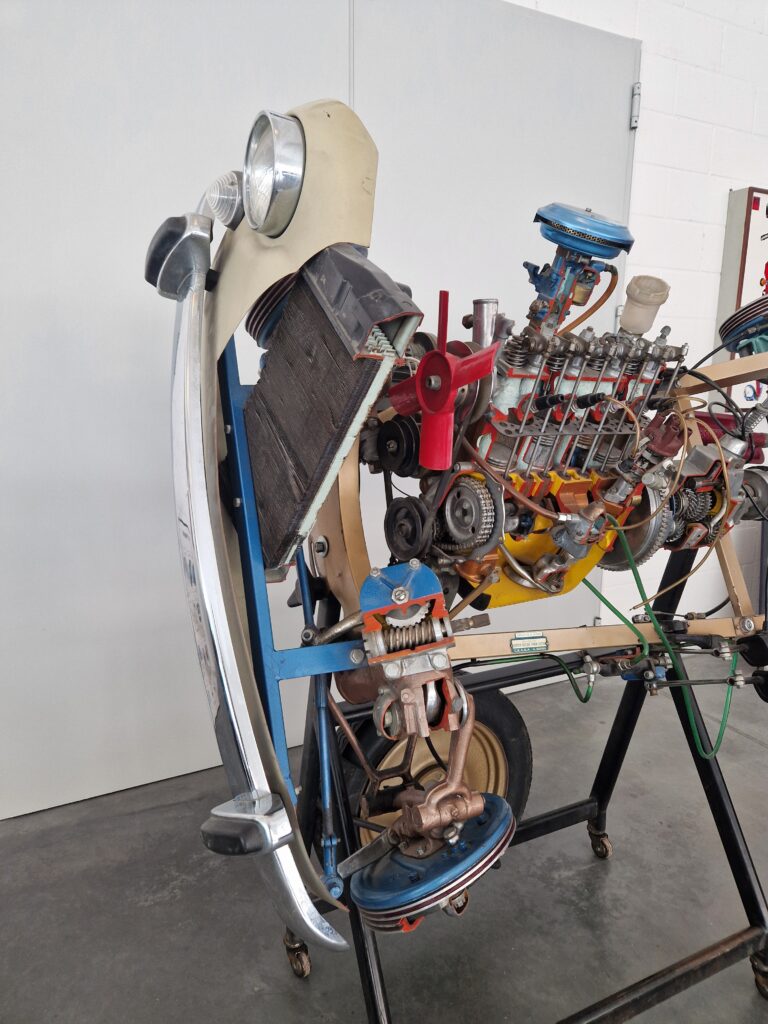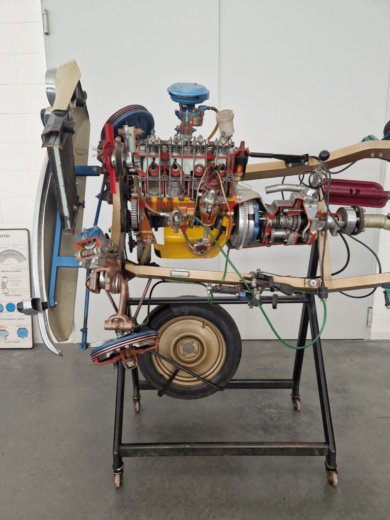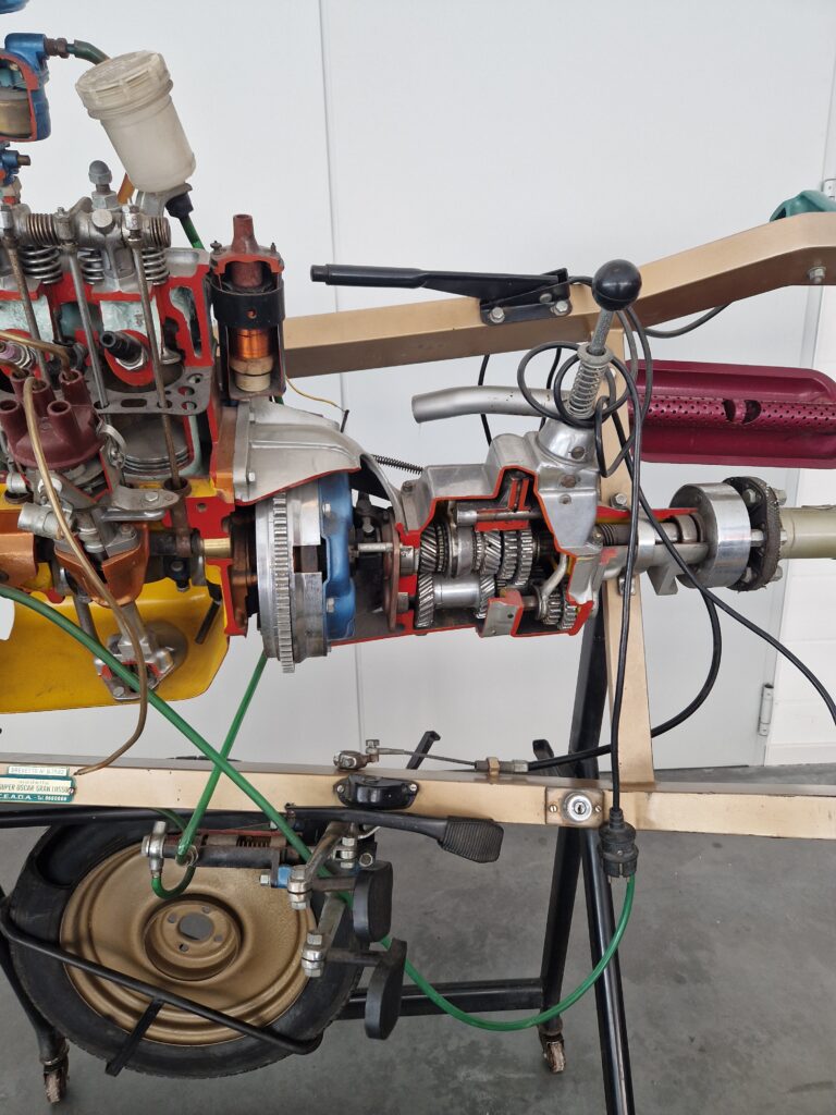 4 cilindri montata su telaio orizzontale, organi meccanici didattici per istruzione scolastica autoscuola, dotato di telaio portante e basculante con ruote girevoli per spostarlo all’interno di un locale.