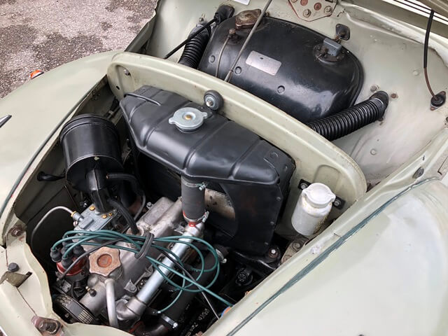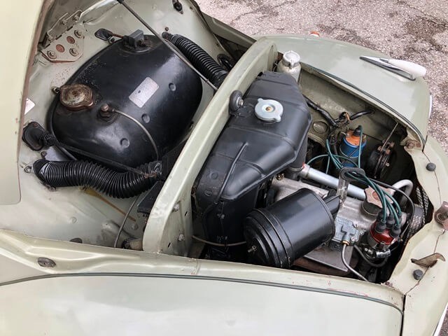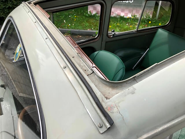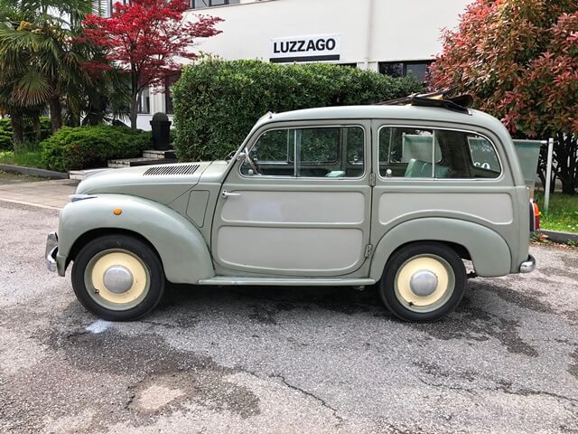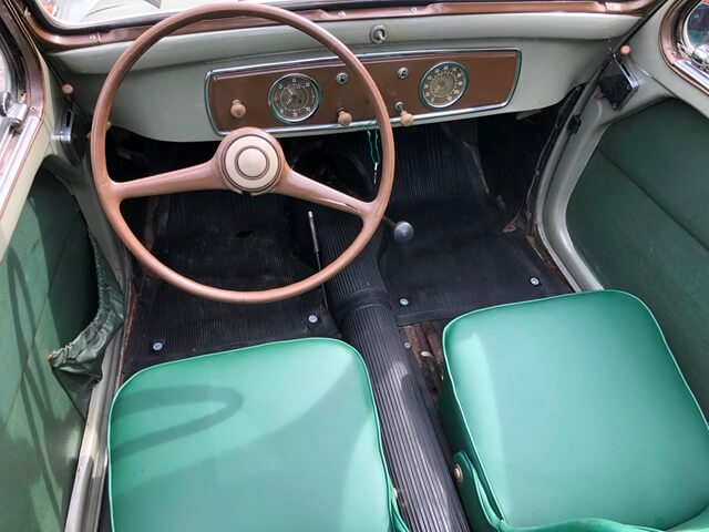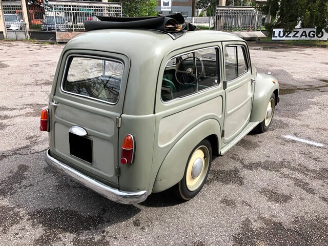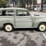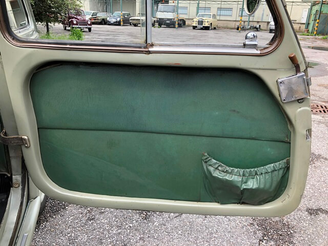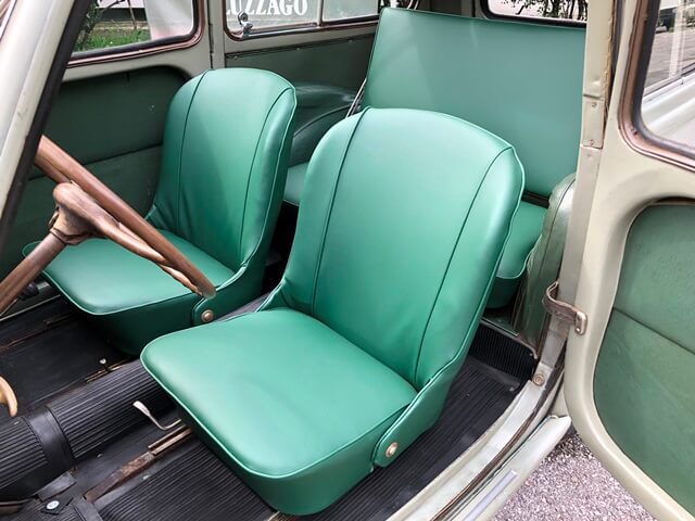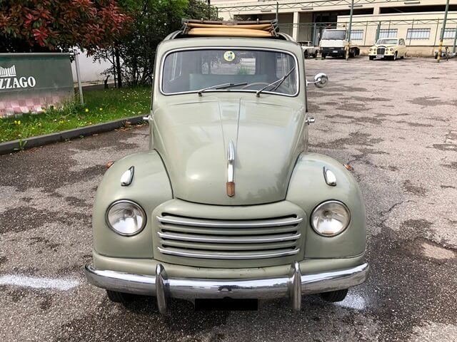 Fiat 500 C Belvedere, targhe nere di prima immatricolazione Brescia, unico proprietario dal 1952. L’auto fu abbandonata diversi anni in un garage nel centro città. Data l’originalità dell’automobile si è deciso di ripristinare interamente la meccanica e gli interni non toccare però la vernice ancora originale opacizzata dal tempo.