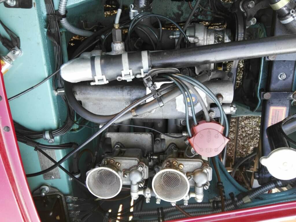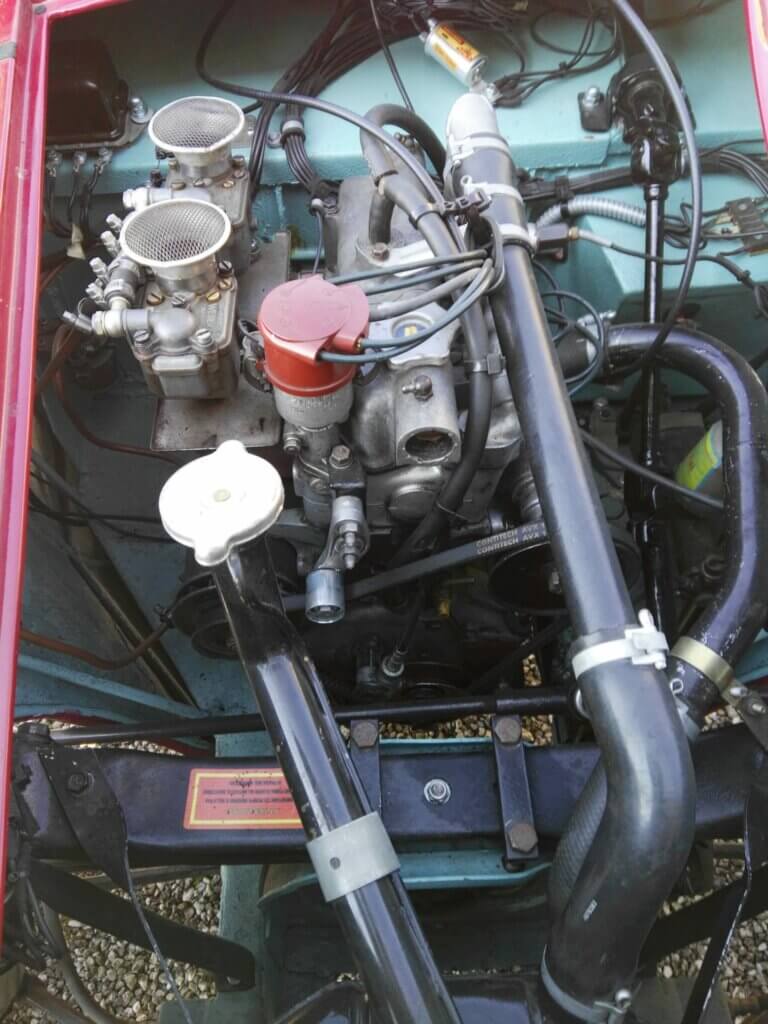 Per quanto riguarda il motore, è stato completamente revisionato (ho percorso solo 35 km). È un motore sportivo, con due carburatori Weber ( come previsto anche da manuale Abarth in dotazione), albero a camme modificato, valvole maggiorate, pompa acqua Abarth con valvola termostatica, coppa olio in alluminio ,maggiorata. (vedere foto).