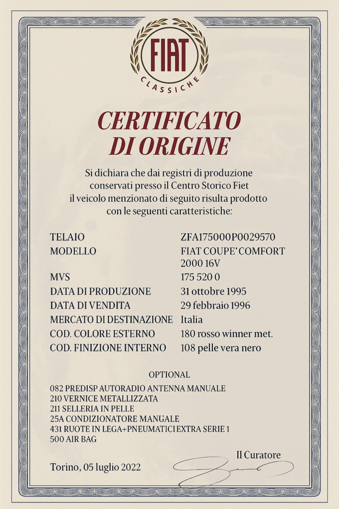 AUTO D'EPOCA - FIAT COUPè 2.0 16V PLUS, 1996 – ASI TARGA ORO