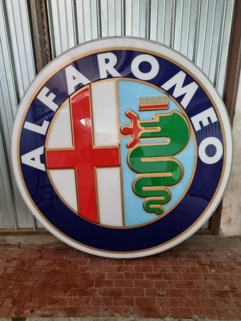 INSEGNA LUMINOSA ALFA ROMEO,  E’ PRESENTE 1 SOLO LATO QUINDI NON E’ PIU’ BIFACCIALE , E’ COMPRESA LA SUA STRUTTURA ORIGINALE IN METALLO, NON E’ STATA TESTATA QUINDI POTREBBE NON FUNZIONALE, L INSEGNA NON PRESENTA ALCUN SEGNO MOLTO BELLA, IL BISCIONE E LO STEMMA CROCIATO SONO IN RILIEVO, MENTRE LA DICITURA ALFA ROMEO NO. DIAMENTRO  MT.1.80. PER ULTERIORI INFO 3396449267. NON SPEDISCO A CAUSA DELLA FRAGILITA’ DELL’OGGETTO . IL RITIRO DEVE AVVENIRE A GAVI, LOCALITA’ VICINO A SERRAVALLE SCRIVIA (ALESSANDRIA)
