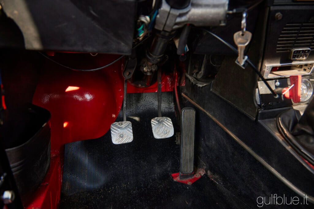 Together with the car there is a second Group 4 engine, to be overhauled, while on the car a short ratios gearbox is mounted (not just the final drive but all the ratios), ideal for special stages and hillclimbs. Long range headlamps, reading light, sport steering wheel, four point harnesses, bucket seats, safety fuel tank and sump-guard complete the equipment of the car. There is as well a second set of wheels with studded tires and some other spares.