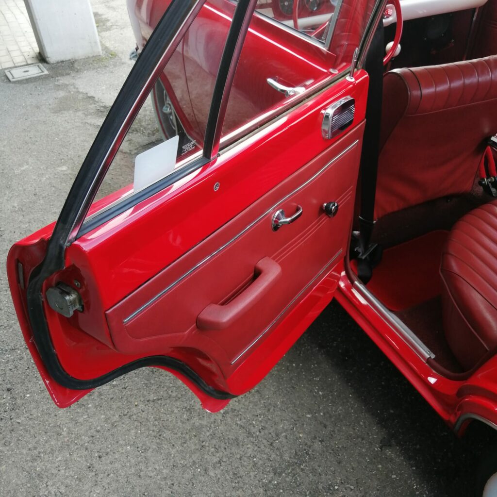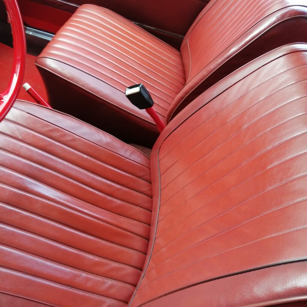 Gli interni sono il vero fiore all’occhiello: la selleria in vinile rosso a cannelloni è originale e intonsa, senza strappi o segni di usura. Moquette, volante e cruscotto sono immacolati. Uno stato di conservazione raro da trovare.