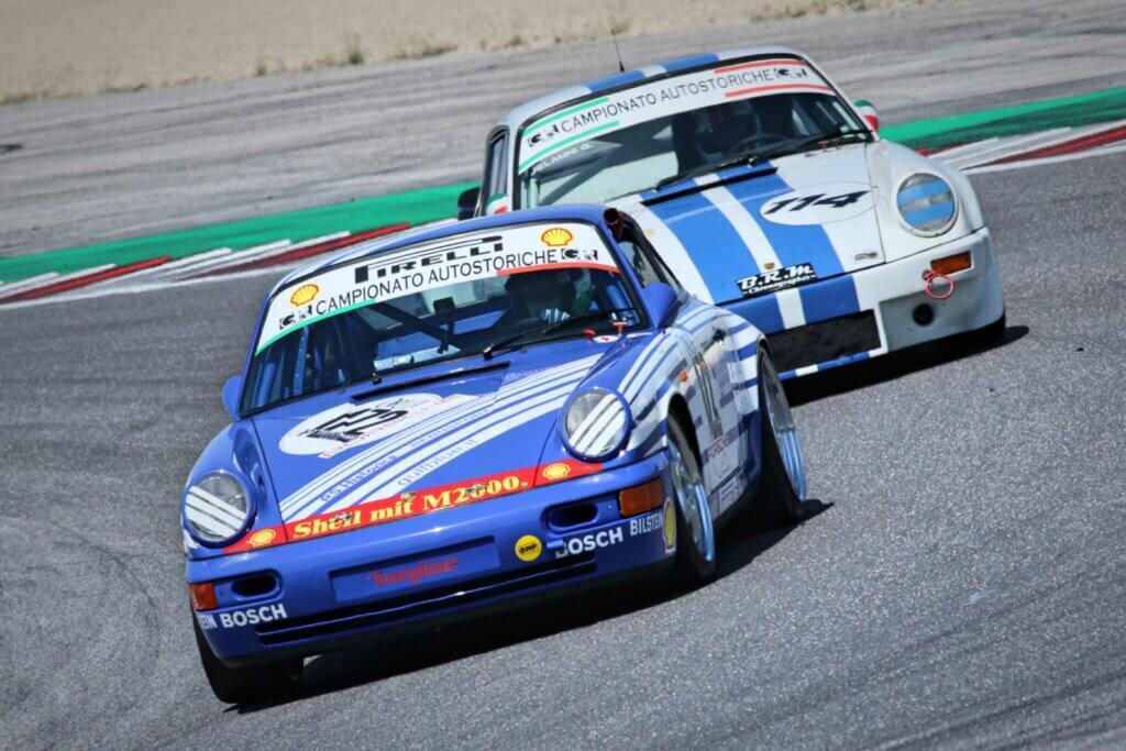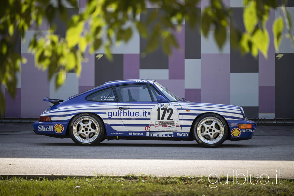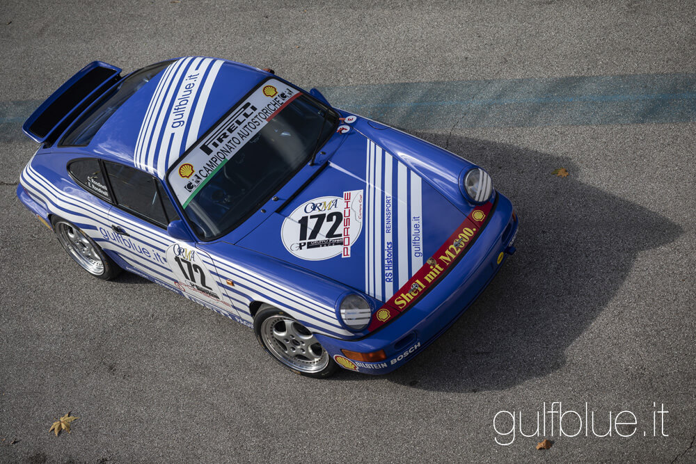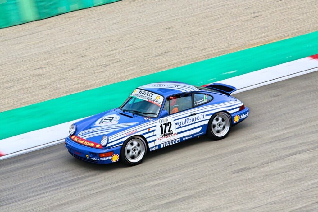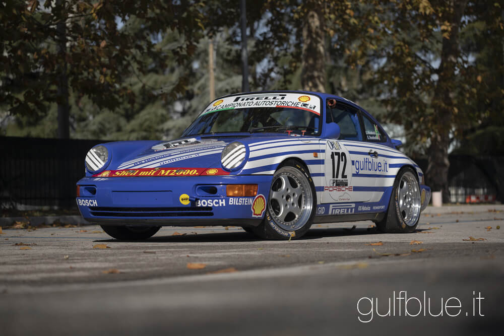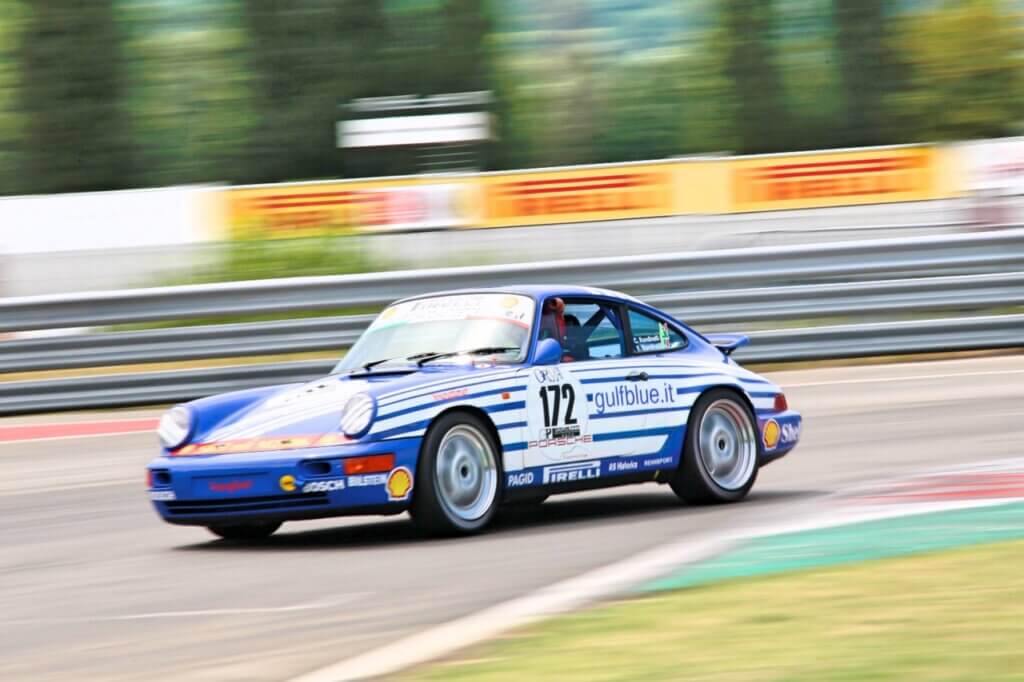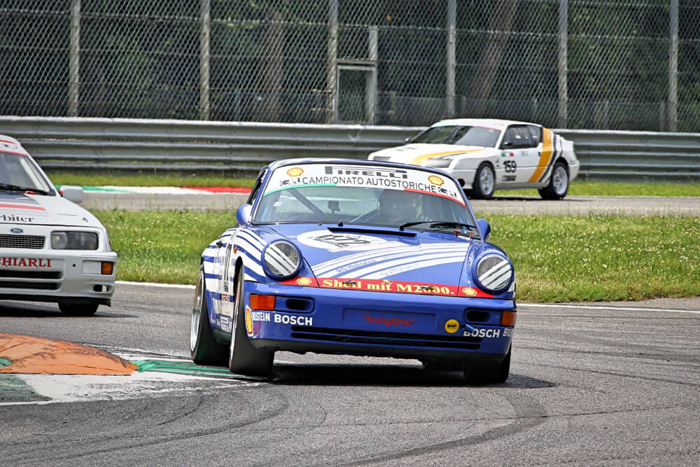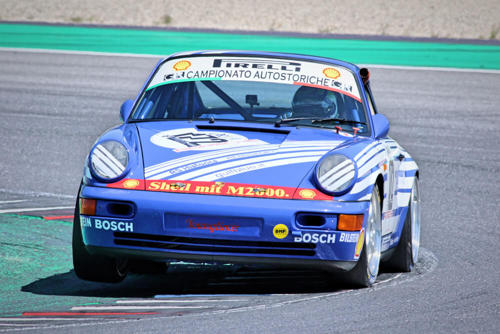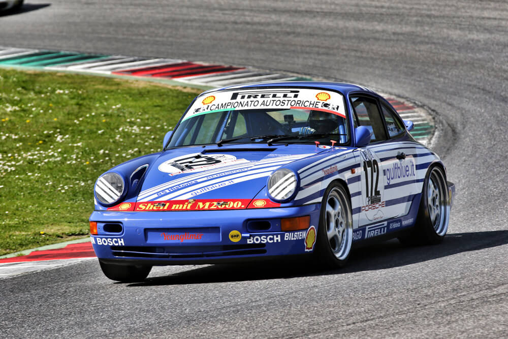 Porsche 911 Carrera 2 (964) Gruppo B con specifiche 1990, curatissima e da noi preparata con tanto amore, con cui abbiamo vinto il Campionato Italiano Velocità Autostoriche – IV raggruppamento – 2018 e 2019. Si tratta della più giovane delle Porsche ammesse nelle competizioni di auto storiche. Non essendo finora ammessi nelle competizioni i modelli Trofeo o Cup, l’auto segue le specifiche Gruppo B, ma si avvicina quasi in tutto alla 911 Carrera Cup, che ha iniziato la sua lunga carriera proprio nel 1990 con la serie 964.