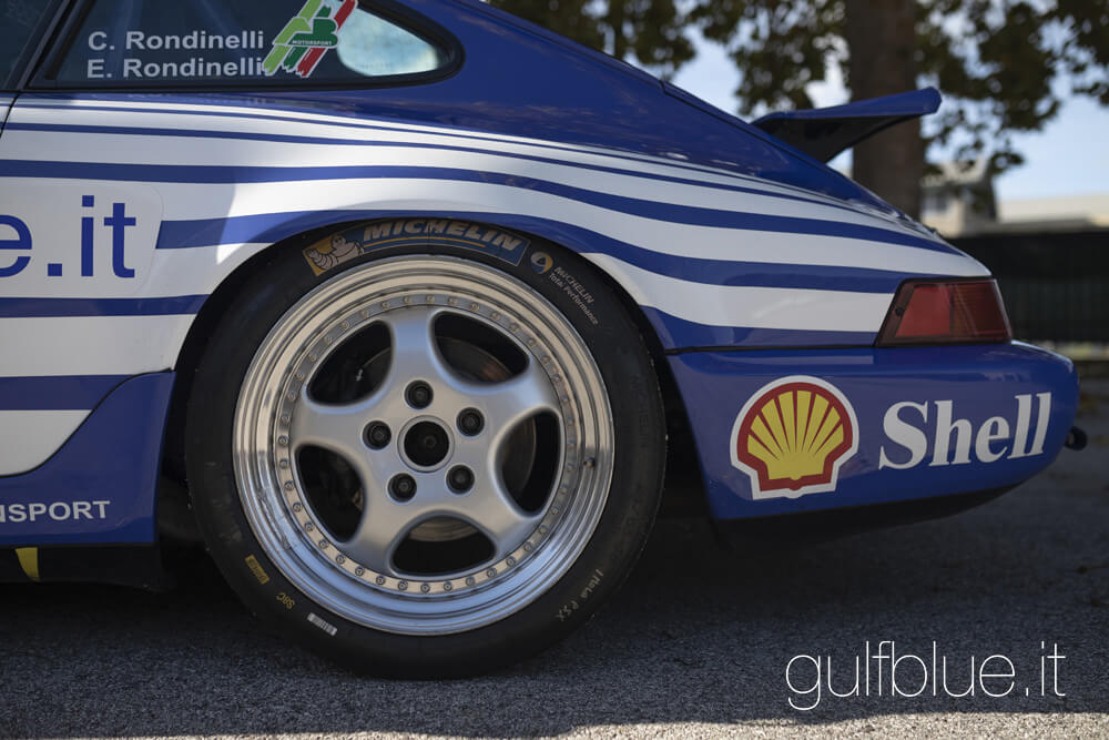 Scocca molto leggera – soli 1110 kg -, portata al minimo ammesso in fiche (1180kg) mediante zavorra. Motore 3,6 preparato secondo il regolamento dell’epoca, con alberi a cammes profilati, bilancieri fissi, doppio radiatore anteriore, cassonetto d’aspirazione maggiorato (essendo l’aspirazione libera, è stato impiegato quello del modello 993), scarico sportivo per una soddisfacente potenza di 300cv (provati al banco). Cambio completamente rivisto per uso agonistico con coppia conica corta, adatta a tutti i circuiti (Monza e Imola compresi). Assetto sportivo su cerchi Cup scomponibili da 18” (3 set) e pneumatici Michelin slick, impianto frenante di serie (come da regolamento) con ABS, ottimizzato per gare di durata.