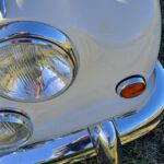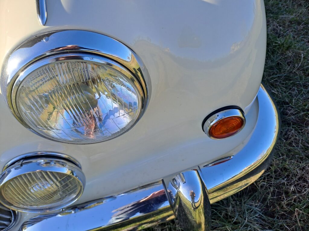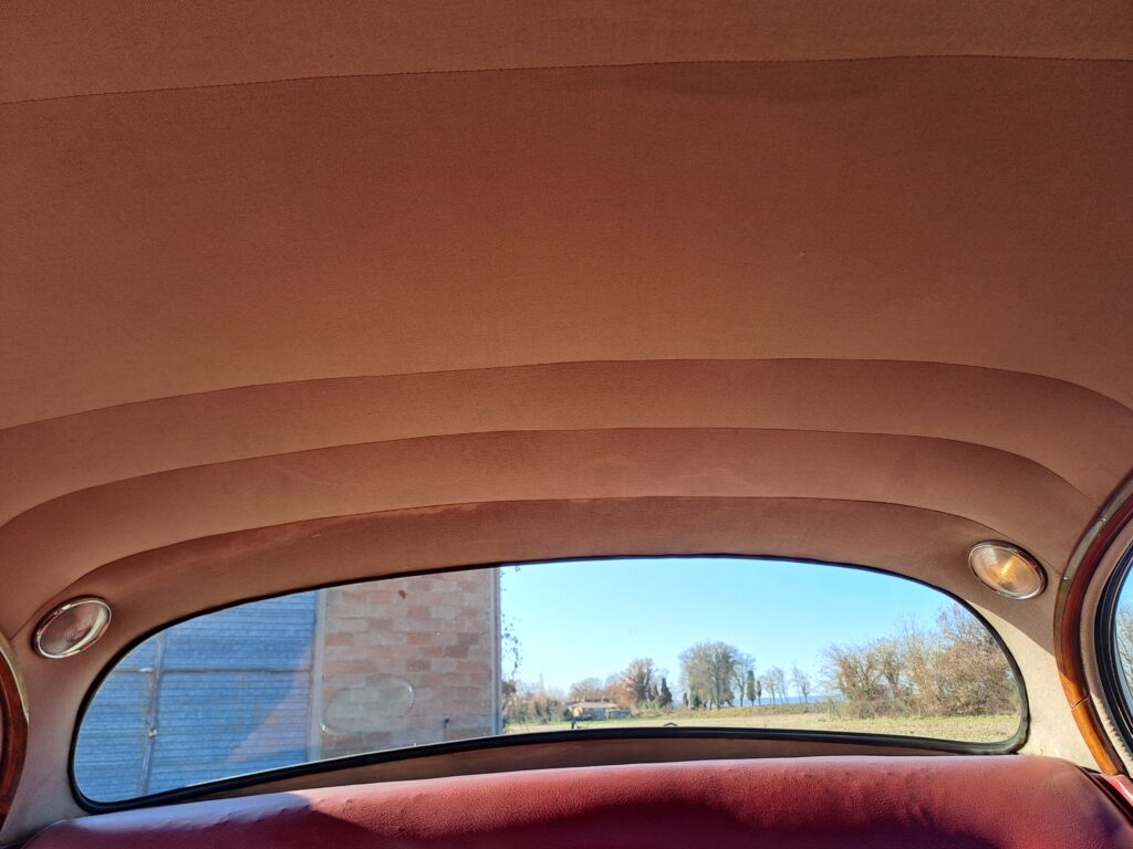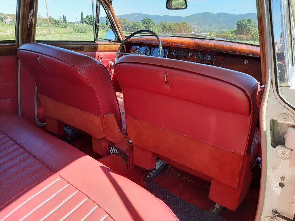 La vernice esterna avorio è liscia e lucida, senza danni visibili. Gli interni sono in pelle rossa e sono anch’essi in condizioni eccezionali.