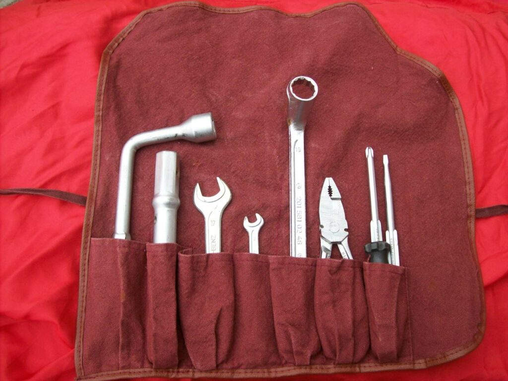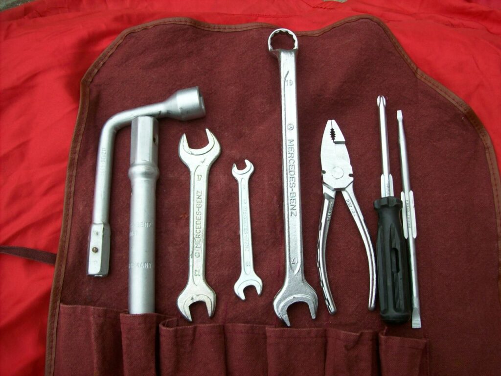 Kit borsa attrezzi originale mercedes benz per i modelli W123 124 126 e derivate ,completa di tutti i componenti.Usata,in buone condizioni per l’età.Euro 50 + spedizione.Info 3472511545