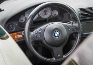 Le sospensioni anteriori McPherson in alluminio e l’inedito retrotreno multi-link con molle ribassate, ammortizzatori specifici, barre antirollio più spesse, molle ausiliarie in poliuretano e snodi sferici in acciaio fanno letteralmente volare questa berlinona come fosse una gran turismo. L’accelerazione è bruciante, la stabilità alle alte velocità è tale da risultare pericolosa per quanto avvolge il pilota in un’ovattata sensazione di onnipotenza. Un effetto accentuato anche dal fatto che, al contrario delle E39 a sei cilindri, equipaggiate con sterzo a cremagliera, l’M5 mantiene il sistema a ricircolo di sfere, come sulle precedenti generazioni, arricchito dal servosterzo Servotronic sensibile alla velocità e regolabile su due livelli di carico tramite il pulsante Sport montato sulla console. Lo stesso pulsante Sport che agisce anche sulle farfalle elettroniche modificando la risposta dell’acceleratore.