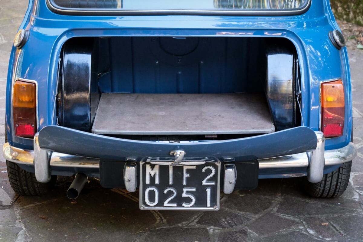 La 1275 è la Mini di serie più performante in assoluto, con 75 cavalli di potenza, albero motore alleggerito, collettori di aspirazione maggiorati e, soprattutto, due carburatori SU HS2 da 1.25″ che pescano benzina da un doppio serbatoio, visibile nella foto col bauletto posteriore aperto.