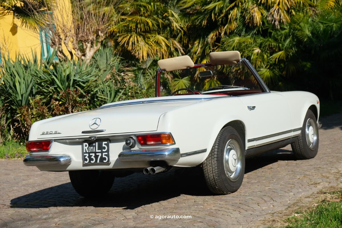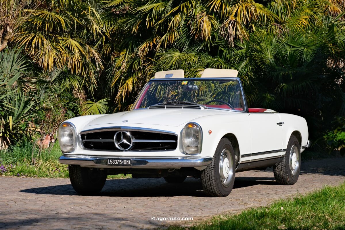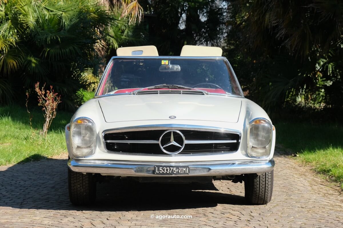 Per raccontarvi la genesi e lo sviluppo della serie R113 abbiamo approfittato della disponibilità di un bell’esemplare appartenente alla collezione del dealer Coopermans.it: si tratta di una 230 SL del 1966, ultimo anno di produzione, venduta da nuova a Napoli e trasferita nella Capitale già l’anno seguente. Fermata a metà anni settanta, è stata recuperata in tempi recenti da un appassionato ed esperto del modello, che l’ha restaurata parzialmente e inserita pure in un volume monografico dedicato alla serie R113. L’esemplare entra nella collezione attuale nel 2008, e subito dopo viene riverniciata esternamente e perfezionata a livello meccanico. Ancora corredata come in origine sia della cappottina ripiegabile che del caratteristico hard-top, questa 230 SL sfoggia ancora gli interni originali, coi legni e i rivestimenti in pelle perfettamente conservati. Oggi la quotazione di una 230 SL “Pagoda” oscilla tra valori molto ampi, con un minimo di 30/35.000 euro per un esemplare da restauro totale (e prevedibilmente oneroso) a oltre 120mila euro per una vettura in perfette condizioni. Al momento della pubblicazione di questo servizio ci sono tre esemplari di Mercedes-Benz R113 inserzionati su Agorauto.com, due 230 e una 280. Date un’occhiata QUI, magari tra di esse c’è quella che fa per voi.